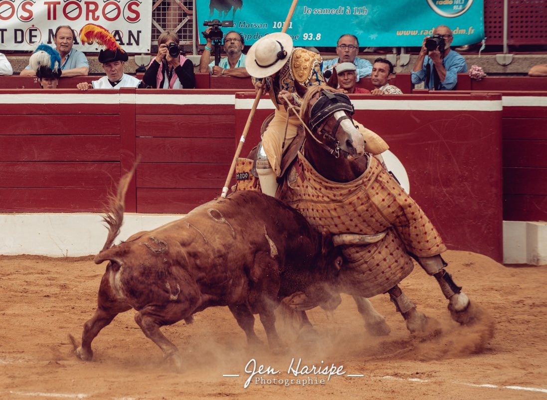 Con el primer astado del domingo vivimos un episodio realmente inusual. El toro era de los que salía escupido del caballo, si bien no era un mansazo exagerado de los que huyen hasta de su sombra. Puede que la acción de Ferrera tuviera mucho que ver con el guirigay que se montó antes de romper el paseíllo porque no estaban pintadas las rayas del ruedo, según hemos sabido después, porque se borraron cuando pasaron la manguera. Quizá fue un gesto de chulería por la exigencia de los aficionados (con razón) para con las rayas, el caso es que después de dos encuentros con el del castoreño de los que el morito salió suelto, Ferrera cogió las riendas del picador Aitor Sánchez y se lo llevó prácticamente a los medios, con el toro en las tablas del nueve lindando con el diez en lo que fue toda una estampa decimonónica. El picador citó y el toro se arrancó al galope, agarrando un buen puyazo en el que el toro se quedó ahí debajo antes de volver a demostrar su mansedumbre. Es cierto que se podrían haber utilizado otros recursos antes de ver al picador citando en los medios, como cambiar los terrenos del equino o hacerle la carioca una vez que hay reunión; que el toro no era un Opaco, para entendernos, pero oye, ese momento de ver al montado ejecutando la suerte desde esos terrenos fue muy emocionante y contra todo proceder consuetudinario.